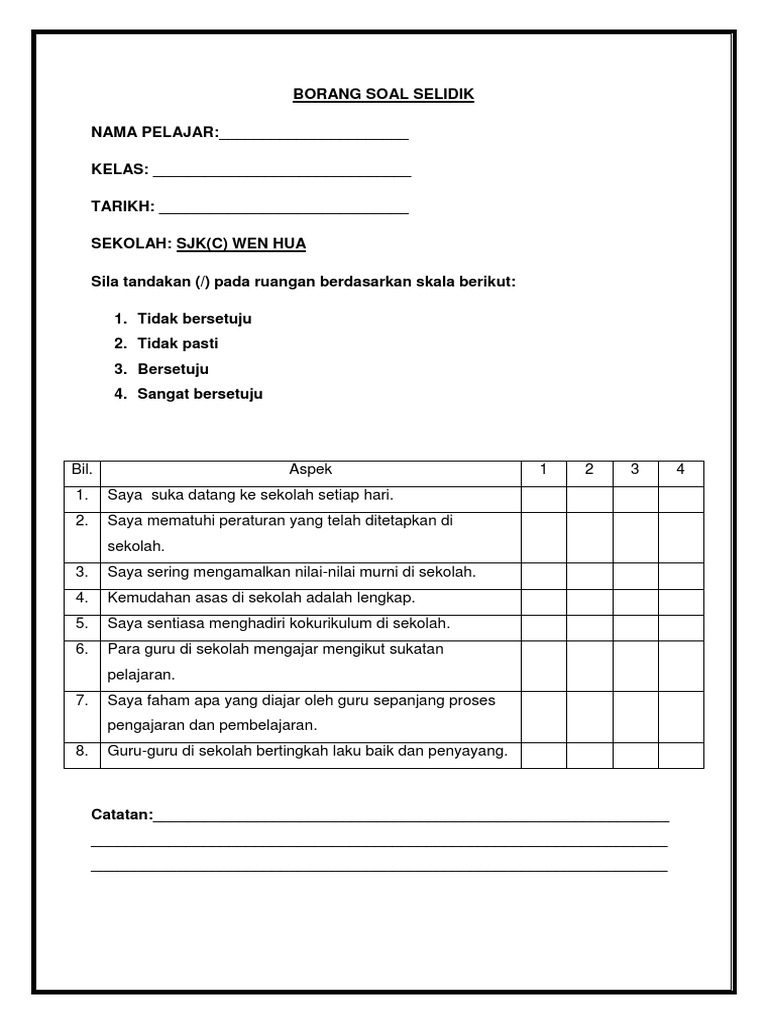 BORANG SOAL SELIDIK PENGUASAAN SUBJEK BAHASA INGGERIS DALAM KALANGAN PELAJAR DI SEKOLAH MENENGAH KEBANGSAAN SULTAN. BORANG KAJI SELIDIK PEKERJA ASSALAMUALAIKUM SALAM SEJAHTERA Soal selidik ini dibentuk bagi menaik taraf syarikat. Lampiran 2 borang temubual kerja kursus pengajian am tajuk.